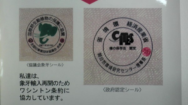 正規ルートの象牙には、環境庁公認又は全国印章業団体協議会を表すシールが貼られています。象牙の印章をお求めの際は、このシールをご確認ください。流通はすべて国が管理していてワシントン条約にて海外への象牙製品の持ち出しは禁止されています。なを、下記のように販売業者は登録が必要で提示しなければなりません。
