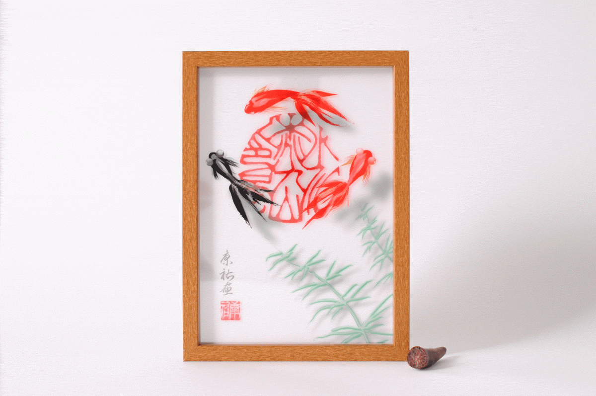 デジタルで描いた金魚と水牛のツノ先に彫った印章の陰影で少し立体的に表現してみました
